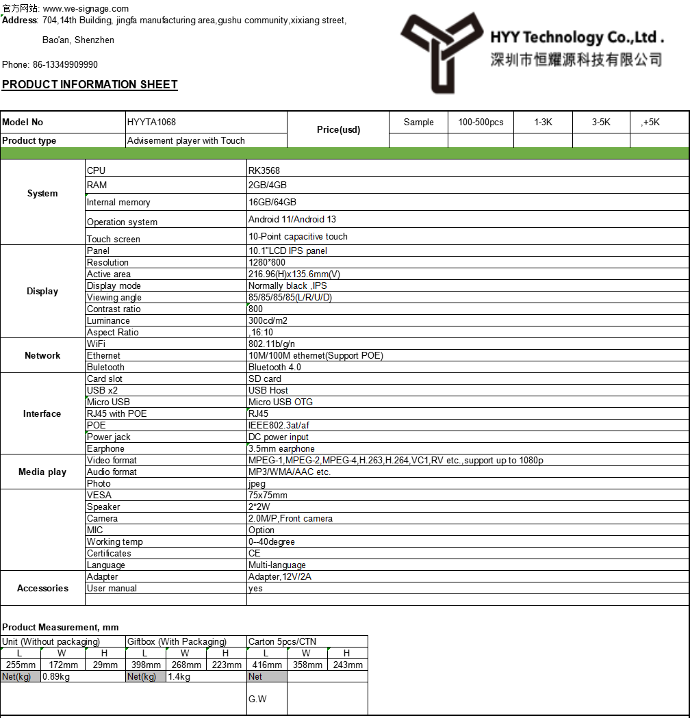 1. Model: HYY-TA1068