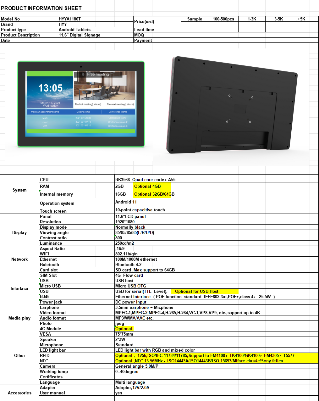 1. Model: HYYA1186T