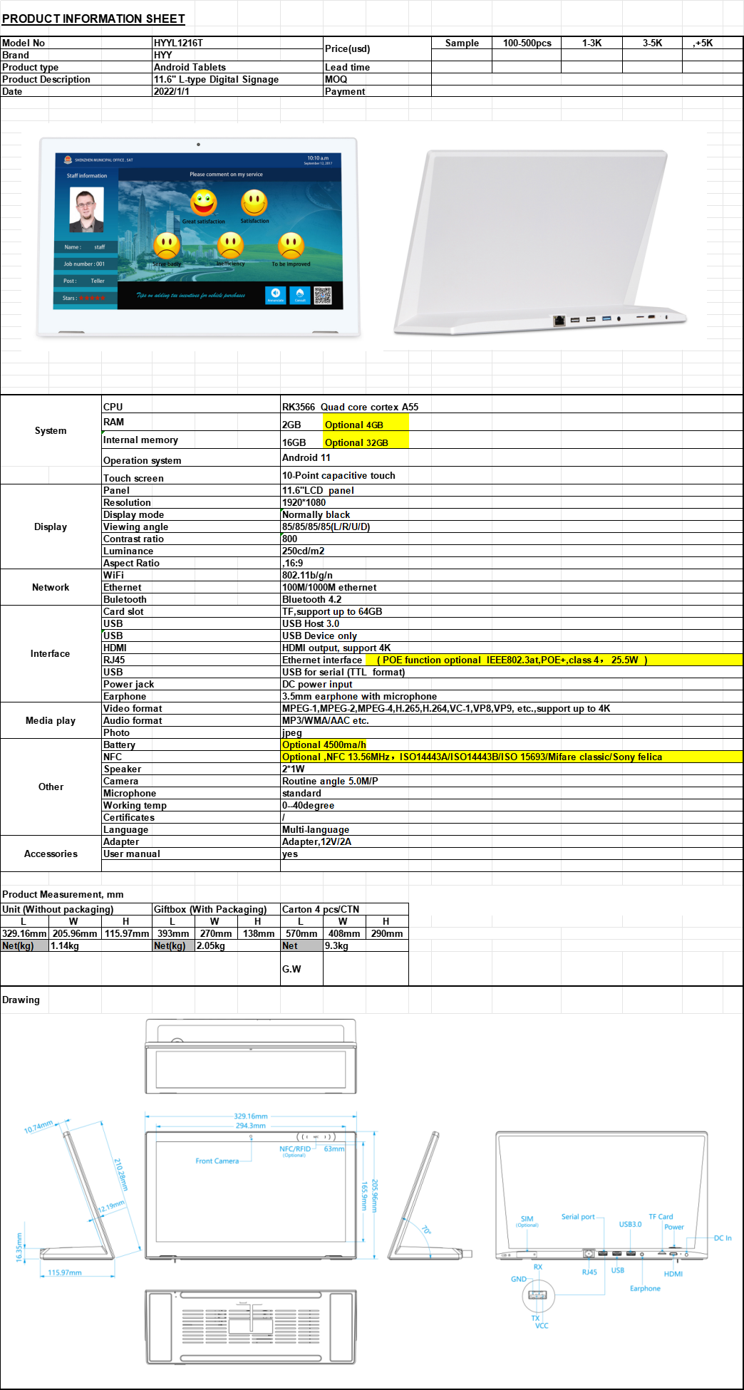 Specifications of the RK3566 L-Shape Table Stand LCD Screen: