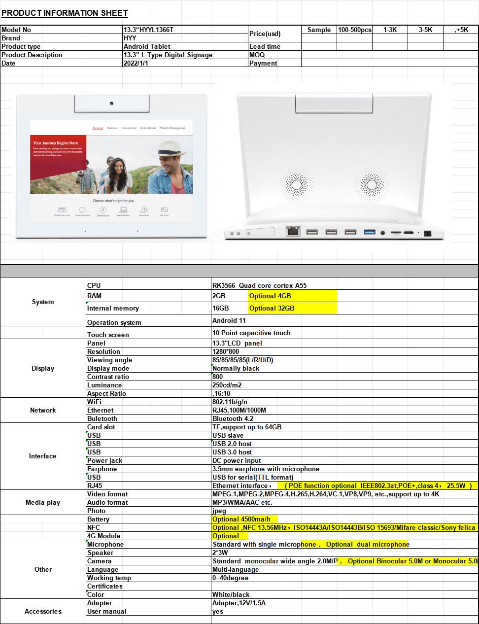 13.3 inch Table Stand LCD L-type Media Player With Camera 1. Model: HYYL1366T 3. RAM: 2GB DDR3 4. Power Supply: DC12V 5. Resolution (pixel): 1920 X 1080 6. Installation: Table Stand 7. Material: Plastic Case + Tempered Glass 8. Size: 13.3 inch 9. Brand: OEM/HYY/SOL/GZY 10. Original: Shenzhen China 11. Delivery Time: Within 3-15 days 12. Payment: T/T; Wester Union