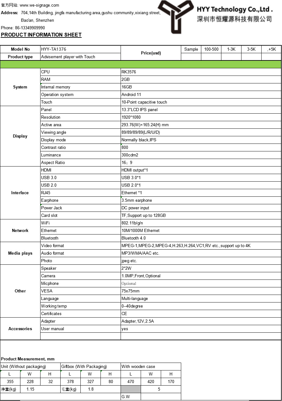 Specifications of the RK3576 Wall Mounted Android LCD Touch Display: