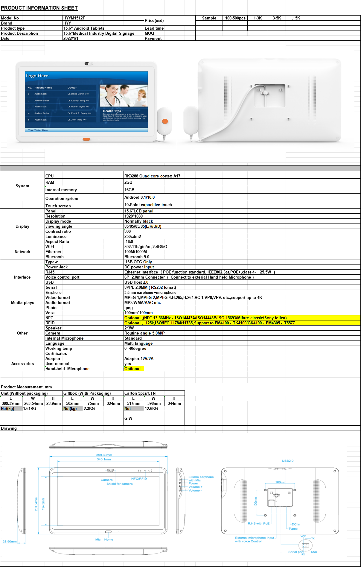 Specifications of the Wall Mounted Android Medical LCD Touch Screen Digital Signage :