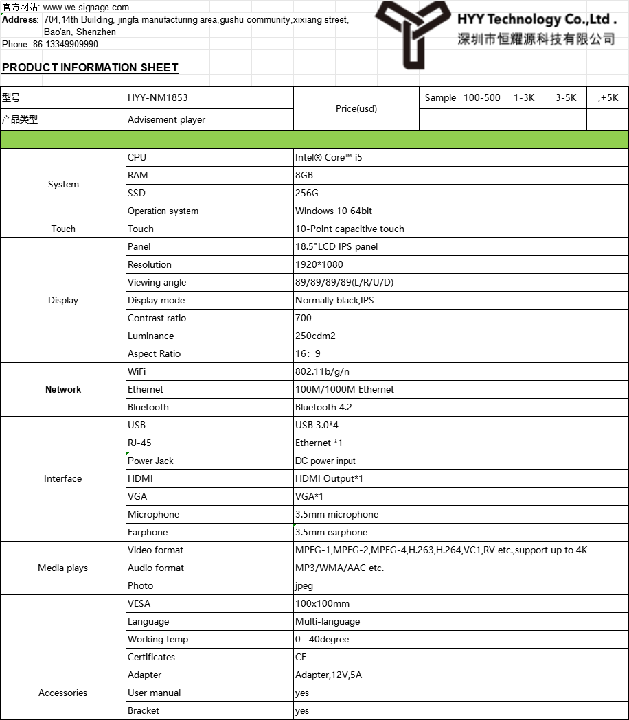 Specifications of the Intel Core I5 Windows LCD Touch Screen Digital Signage: