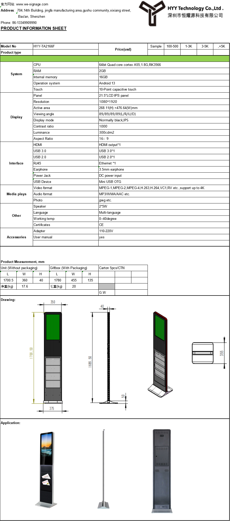 Specifications of the RK3566 Android LCD Multi Touch Screen Kiosk: