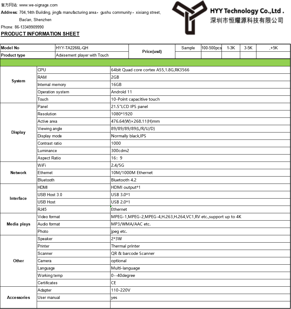 Specifications of the RK3566 Floor Standing Self Service Kiosk Digital Signage: