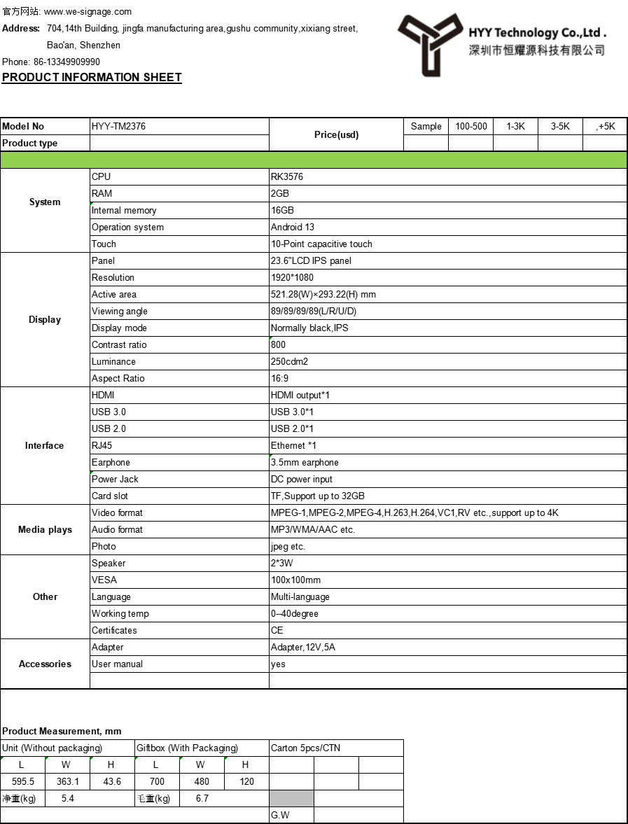 Specifications of the RK3576 Wall Mounted LCD Android Digital Signage: