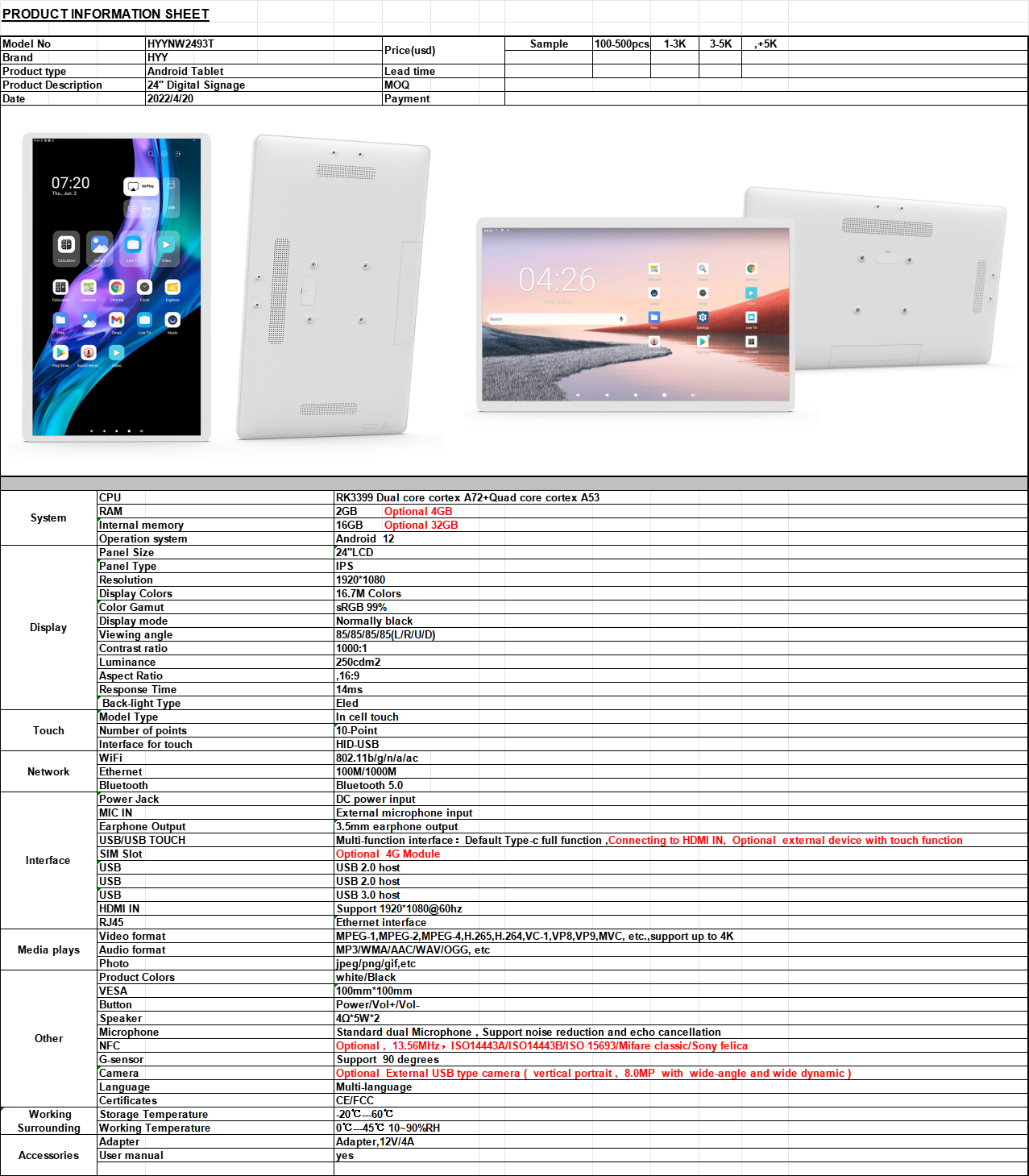 Specifications of the 24 inch Wall-Mounted Smart TV Touch Screen Monitor: