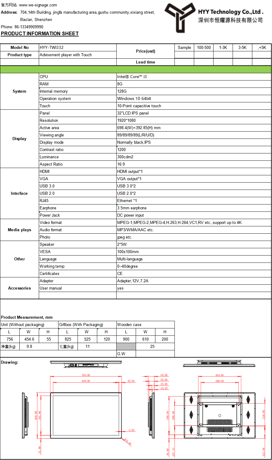 1. Model: HYY-TWi332