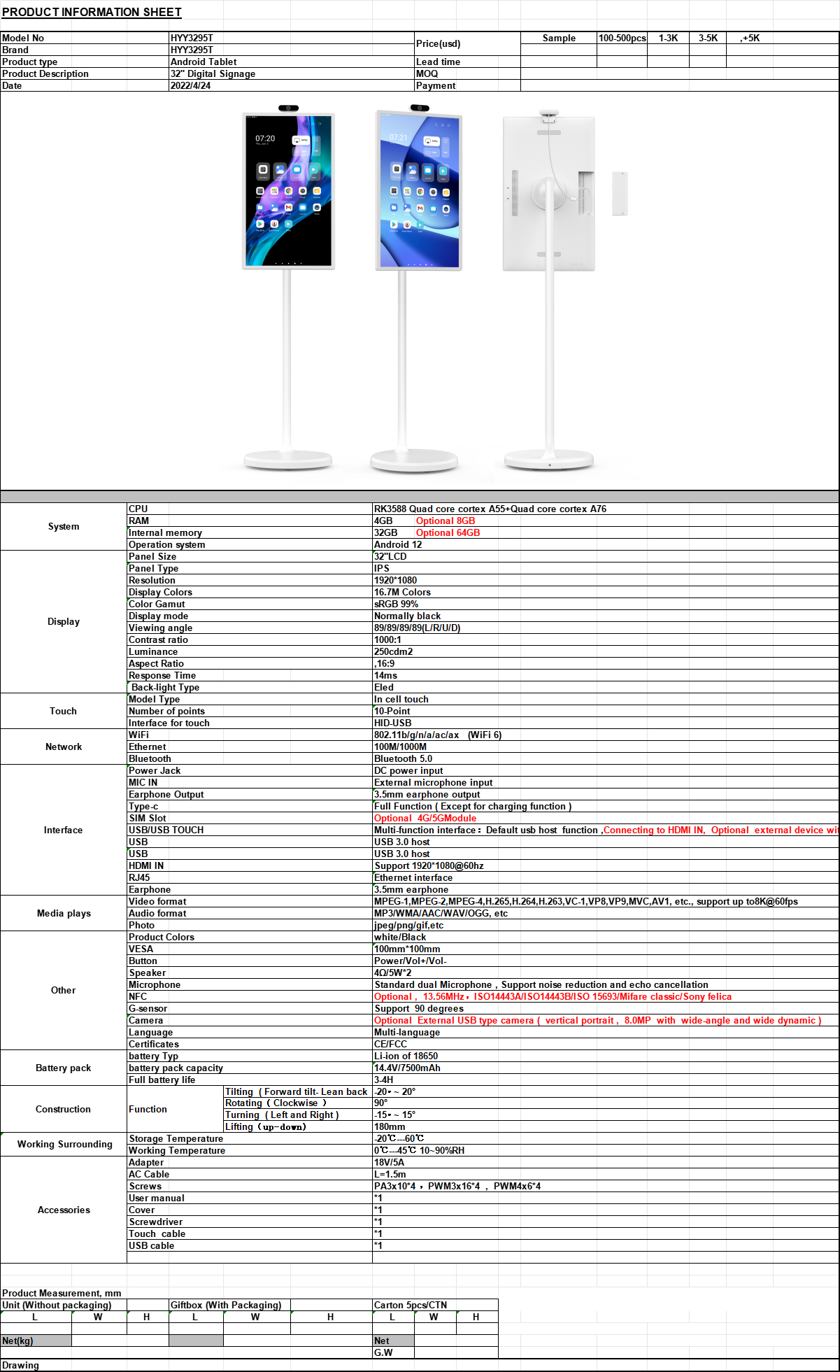 Specifications of the RK3588 Capacitive Floor Standing Touch Screen LCD Android Smart TV :