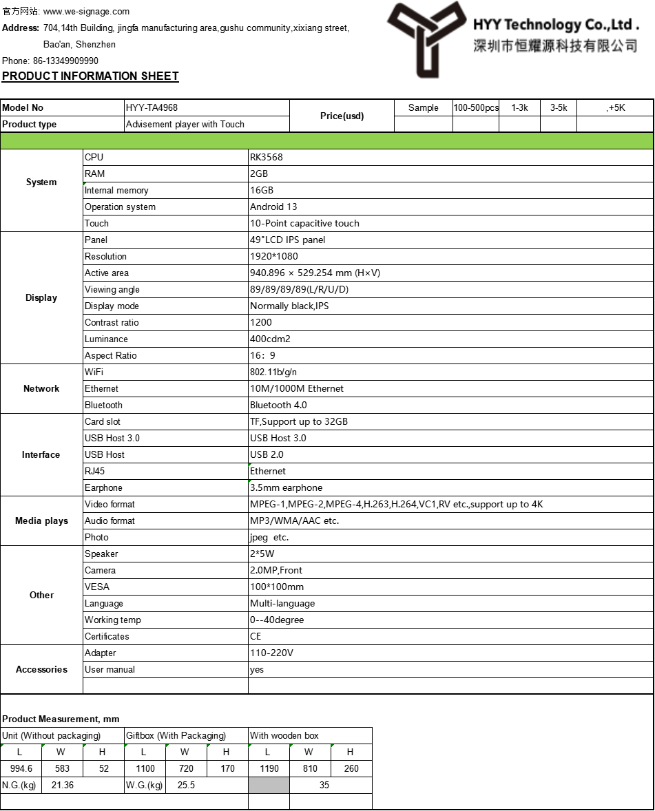 Specifications of the Advertising LCD Touch Screen Display: