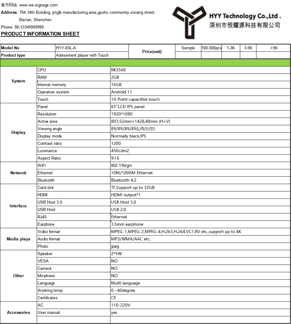 Specifications of the Custom OEM/ODM Digital Display Boards Kiosk Booth LCD Advertising Player: