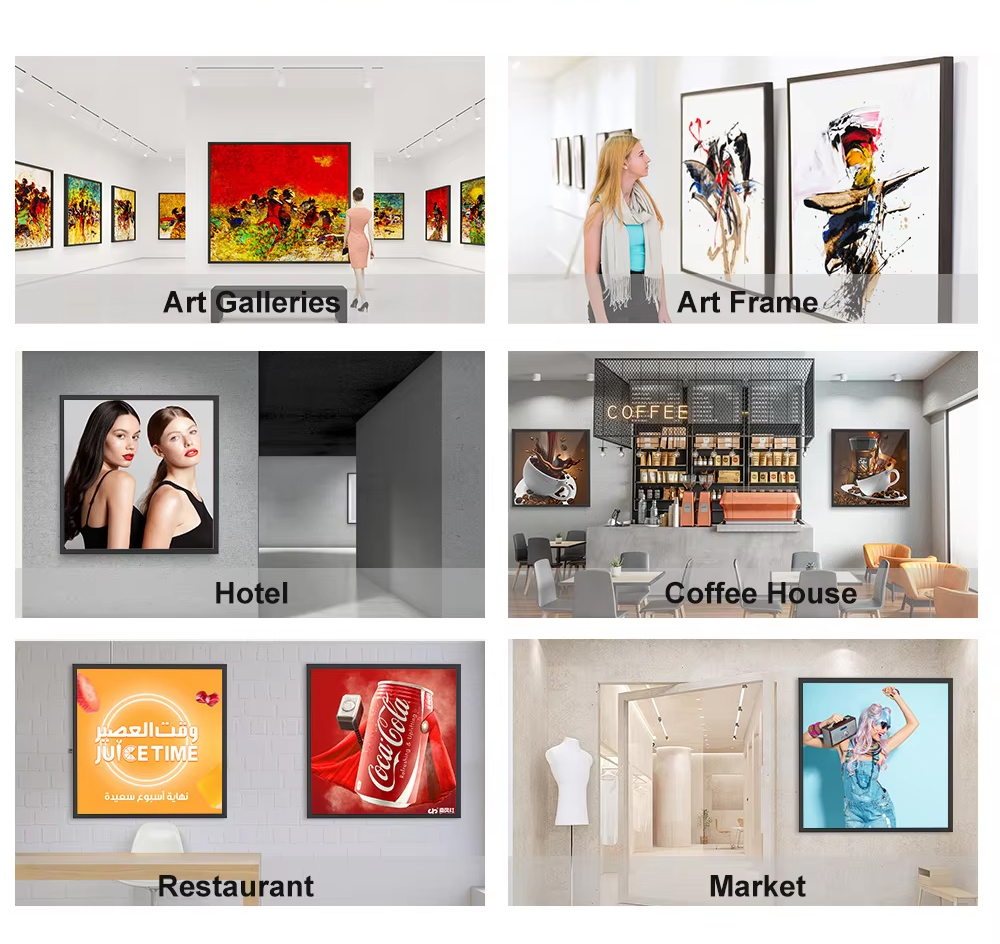 Our Android-based square wall-mounted monitor features ultra-slim design with HD display and smart content management, ideal for six artistic & commercial spaces: