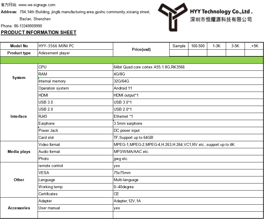 Specifications of the RK3566 Android System MINI PC Advertising Player Box:
